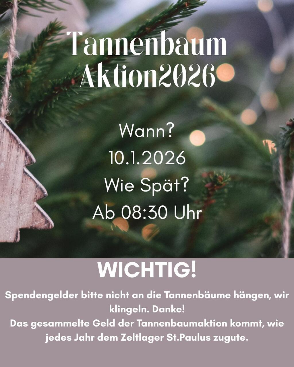 Spendengelder bitte nicht an die Tannenbäume hängen, wir klingeln. Das gesammelte Geld kommt dem Zeltlager St. Paulus zugute.
